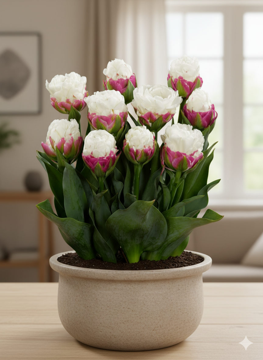 Для успішного вирощування тюльпанів «Ice Cream» у кімнатних умовах оберіть світле місце з м’яким, розсіяним освітленням.